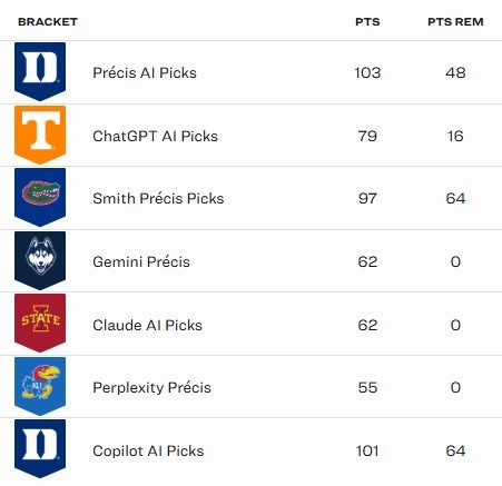 Over the last few weeks of March Madness, Précis has been running a “Man vs. Machine” experiment, pitting the NCAA Men’s Basketball bracket of Stephen A. Smith of ESPN against those created using six generative AI tools.