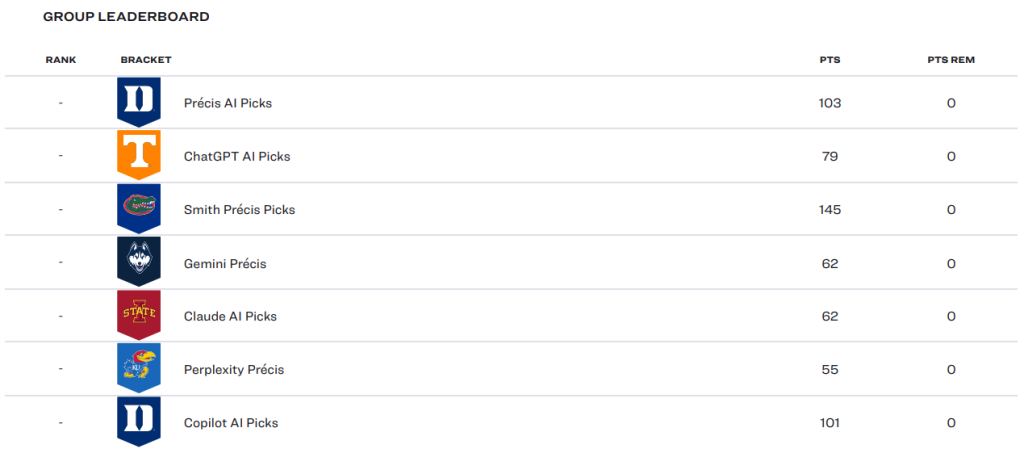 Second place in our tournament, and winner among the AI tools, Précis AI, was still a hefty 42 points behind Smith with 103 points. Microsoft Copilot was close on Précis’ heels with a total of 101 points. Following Copilot was ChatGPT with 79 points.