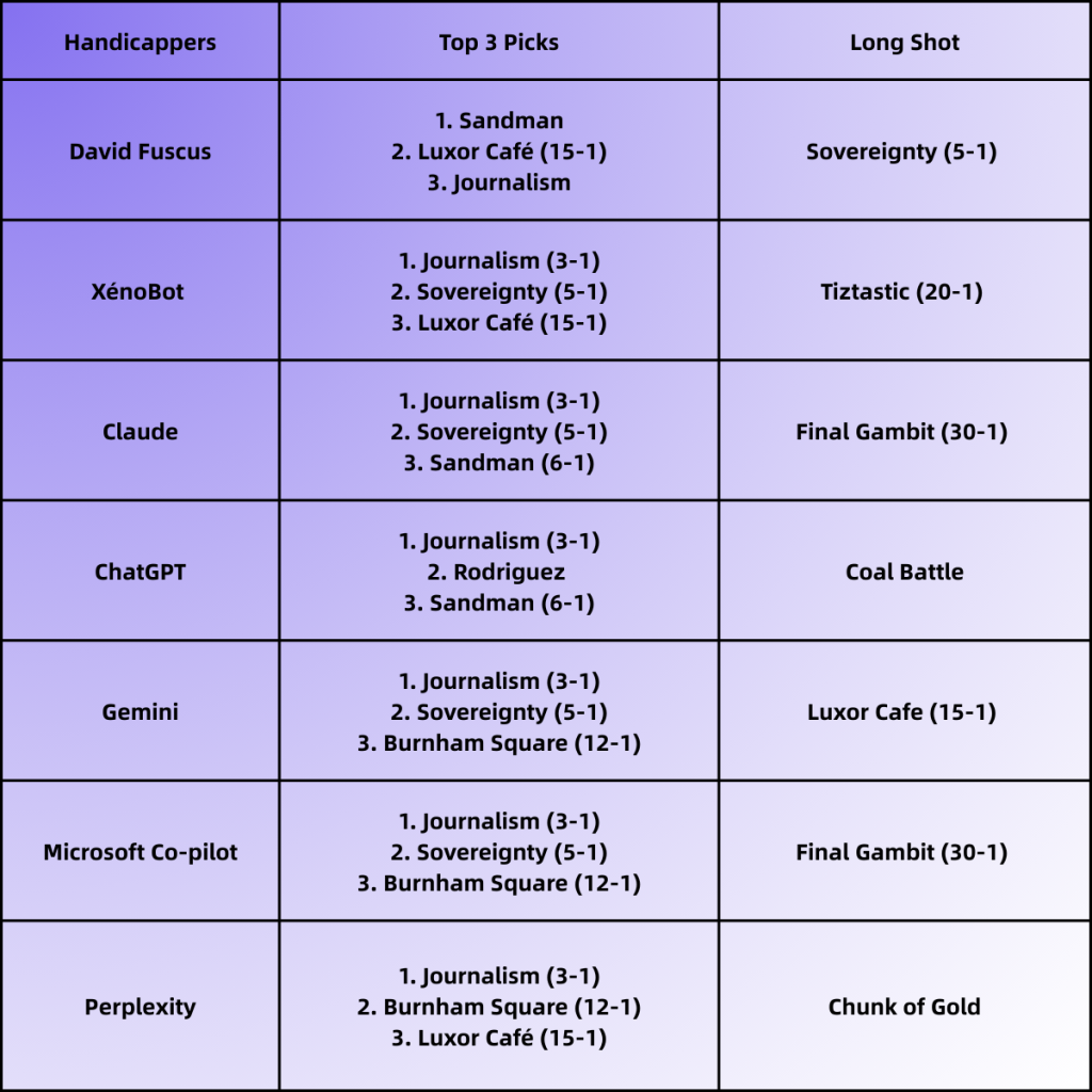 The AIs are rallying around the mainstream favorite, with all six picking Journalism. Both sides are rallying around similar picks, like the stalwart favorite emerging from the muddled assortment of odds being the consensus. With its strong West Coast credentials and consistent momentum, Journalism represents the data-driven option that algorithms cherish—making it the darling in the AI lineup.
